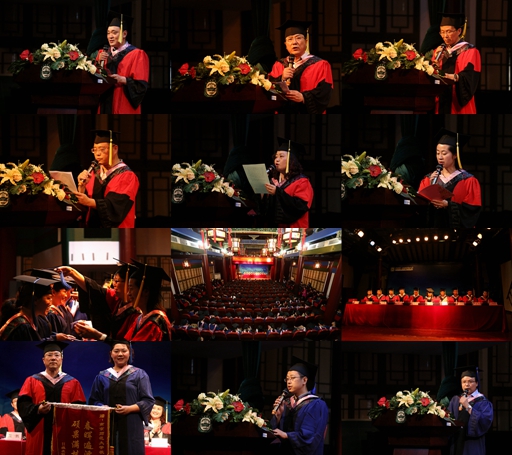 党委书记张杰老师宣读了表彰优秀毕业研究生和优秀研究生干部的决定,由马复教授宣读了授予学位的决定。伴着激昂的音乐,身着蓝色硕士学位服的各位毕业生依次上台,与会领导、教授依次为获奖同学颁发奖状、热情握手。又为全体获得学位的毕业硕士生扶正流苏,浓情寄予祝贺,并与同学们合影留念。在座全体师生报以热烈掌声,这既是对毕业学子的祝贺,更是对未来的深情祝福。