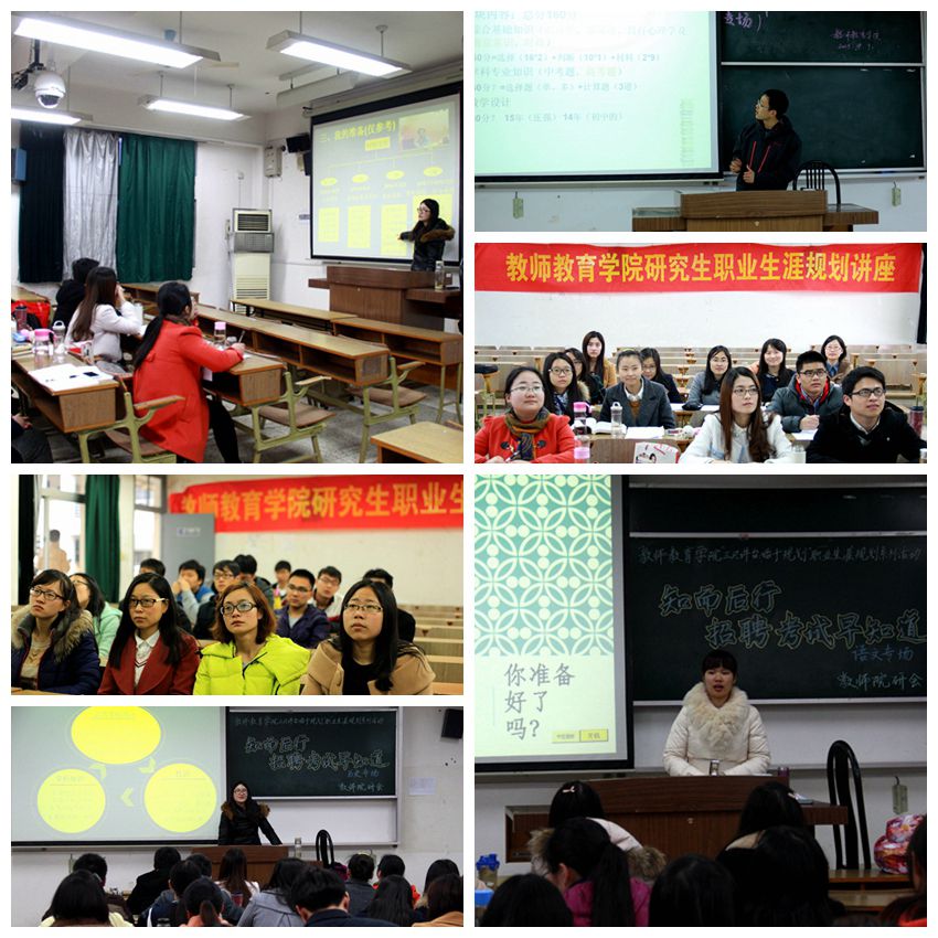 14级研究生在仙林校区学正楼408教室分别参加了“三尺讲台,始于规划”教师招聘系列讲座。学院邀请到了13级学科教学专业严京、刘梦琰等九位优秀的学姐来讲解她们的考编经历以及一些学习心得。该讲座针对九门学科,分为九场召开。