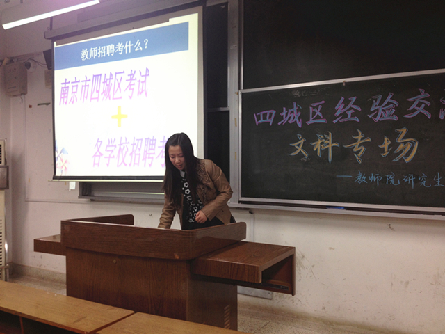 首先由高珊学姐与在座同学分享考试经验。高珊学姐从介绍教师招聘考试内容开始,循序渐进地为同学们提供相关信息。南京教师招聘考试分为四城区考试和学校单独招聘考试。关于四城区考试,学姐主要从题型分析及如何做准备两方面展开。高珊学姐特别强调了案例题的作答方式,提醒同学们结合自己的教育经验,用简练的语言回答。在总结各题型特点后,学姐建议在座不同专业研究生针对学科特点,充分分析教材,根据不同题型梳理知识点。关于如何准备笔试,高珊学姐以简练的短语进行了概括总结:灵活应对、联系实践、熟练掌握学科知识、关心生活、走入课堂。接着,学姐介绍了学校单独招聘考试的流程,主要分为投简历—笔试—面试—说课—试讲—校长面试这几个环节。在对每一环节进行分析后,将成功应对学校招聘归为以下几点:一份好简历、一次宝贵的教学经历、一份好仪态、一份好心态以及熟练的教学技能。最后,高珊学姐祝同学们在四城区考试中取得好成绩,在座同学给予了热烈的掌声。