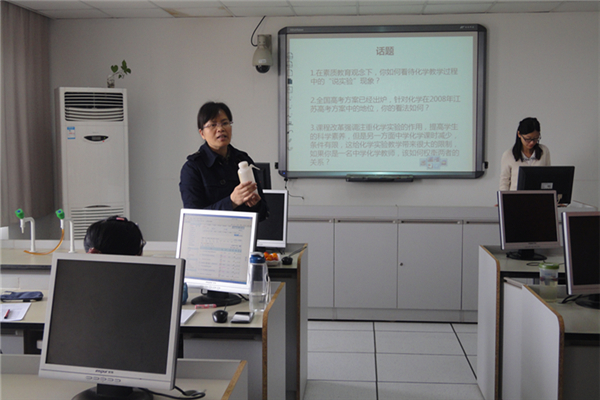 本场“研师论道”学术沙龙活动于上午9:00准时开始,此次学术研讨活动针对化学专业的研究领域,就“找到开展化学实验与高考方案中化学的地位之间的平衡点”展开交流和讨论,旨在带领同学们透彻地讨论在高考方案下如何开展化学实验教学。活动期间,各位同学踊跃发言,激烈讨论了“在素质教育观念下,你如何看待化学教学过程中的‘说实验’现象?”、“全国高考方案已经出炉,针对化学在2008年江苏高考方案中的地位,你的看法如何?”、“课程改革强调注重化学实验的作用,提高学生的科学素养,但是另一方面中学化学课时减少,条件有限,这给化学实验教学带来很大的限制,如果你是一名中学化学教师,该如何权衡两者的关系?”等问题。