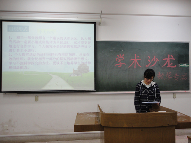 下午四点整同学们齐聚学正楼509教室,等待着活动的开始。此次数学专场的主题是《漫谈数学探究教学》。同学们又分别从五个话题入手围绕主题进行经验交流:数学探究式教学的生命力何在?数学探究式教学缘何步履维艰?如何设计有效的数学探究活动?数学探究活动有哪些组织形式?在数学探究活动中教师发挥着什么样的作用,有哪些课堂教学策略?主持人宣布了此次活动的主要内容安排和活动流程,并向在场同学介绍了参与活动的嘉宾老师。第一小组代表上台交流,她做的报告题为“数学探究式教学的生命力何在?”,她向同学们介绍了数学探究教育的生命力和意义所在,并以word形式向我们展现了她的研究成果。在报告结束后顾老师做了相应的点评,让同学区分探究教学与发现教学之间的区别,并将接受学习中各种学习方式进行分类。并要采用更加理性的态度来面对探究教学,相比探究教学,传统的启发学习也有其无法取代的优势,我们所需要做的就是更加理性的对待。并对探究学习的定义、功能、分类进行了进一步的阐述。同学也就她的演讲表达了自己的疑问,顾老师也都做了十分详细的解释和说明。这种面对面的交流和讨论对于大家理解和提升学科教学思维、补充响应的教学理论的空缺有很好的帮助。随后上场的第二小组代表向同学介绍了探究式教学在目前实施过程中所遇到的困难和障碍,并从教师和学生两个角度进行原因分析。教师由于课时紧张等因素而放弃探究式教学,而学生习惯了接受性学习,不愿自发探究,也不愿将自己的研究或学习成果与大家分享。并且阐述了探究式教学已经沦为公开课做样子的形式。希望大家在今后的教学过程中利用好探究教学。数学班负责人又总结并补充了一些探究式教学中存在的问题与解决方式。随后又有三个小组的代表依次就数学教学中有关探究性教学的组织形式、策略、高效性的提升三个方面展开了论述,做了报告。