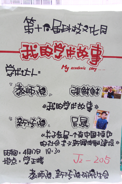 4月17日晚上六点半,第十六届科技文化月之“我的学术故事”活动在仙林校区学正楼205教室召开。此次活动由教师院与新传院研究生会联合主办。旨在营造我校浓郁的研究生学术氛围,培养研究生热爱学术、潜心学术、奉献学术的精神。教师院和新传院研究生会邀请了两位研究生学术达人主讲,分别是新传院研一的吴晟同学和教师院研二的张鲜鲜同学。两院同学都积极参加了此次活动,现场气氛热烈。