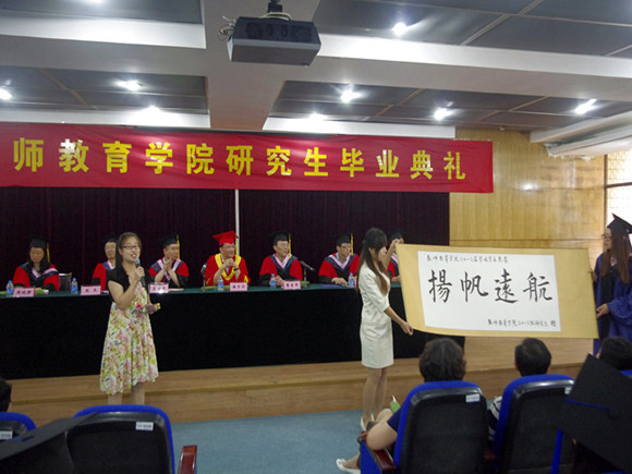 临别之际,师生们感慨万千。校外兼职导师代表、南京十三中特级教师曹勇军老师首先发言,他向通过不懈努力完成学业的毕业生们表示祝贺,提醒大家做好为教育事业奉献的准备,并希望在座同学能够通过学术训练,享受教育的诗意。学科导师代表马丽娅老师在真诚祝贺各位同学毕业的同时,也提出了自己的几点希望:坚持读书、更新知识;坚持为善、修己敬人;坚持平和,常怀感恩。朱晓影同学代表全体毕业生发言,她深情地向母校致谢,向老师致敬,与同学惜别。全体毕业生用手绘贺卡和鲜花,向辛勤培育自己的老师们致谢并相拥告别,同时用刻录寄语的光盘,向学弟学妹们表达自己的深切关怀。在校研究生将自己书写的“扬帆远航”卷轴作为回赠,表达对学长学姐的美好祝愿。