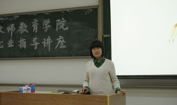 孙璐学姐首先上台向大家介绍了教师招聘考试的大致情况。她告诉同学们教师招聘考试的形式可以分为特聘和统招两种,每一种考试的范围与内容均不大相同。在准备教师招聘考试的时候,大家应该做一些高考题,掌握一些教育学、心理学知识,同时还要密切留心身边的大小事情。另外,她特别提醒现场同学,如果想要获取招聘考试的信息,可以到校园网络、就业信息网站和心仪学校、地区教育局的网站去查询。最后,孙璐学姐建议大家现在就可以做些准备工作,比如找寻合适的复习材料,做高考题、总结方法,熟悉材料、学会编写教案,了解基本的教育学、心理学知识并且多看书、多积累等等。