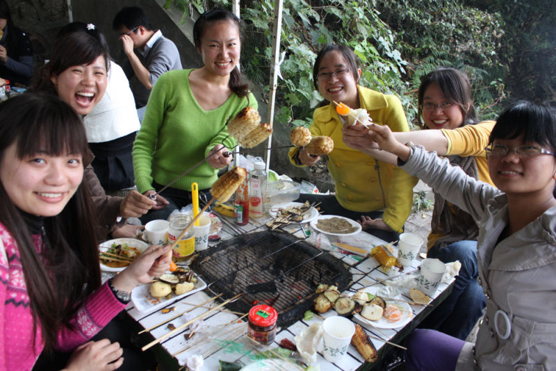 另一方面,移洁、丁莹、尚露露等同学开始为烧烤做准备,切茄子、预热碳炉,忙得不亦乐乎,厨艺才能可见一斑。11时左右,全体同学都投入到了热火朝天的烧烤中。虽然是第一次集体下厨,不过大家配合默契,很快就掌握了烧烤食物的制作方法,做出了香鲜可口的美味。同学们还发挥创意,尝试烤香蕉、烤橘子等各种吃法,其中一道烧烤味鱼香茄子更是博得大家的一致好评。女生们真可谓上得了厅堂,下得了厨房!