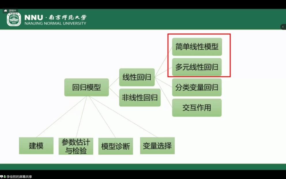 本场讲座围绕着线性回归的基本概念、基本原理和操作应用三个方面的内容展开。首先,对于线性回归的概念阐述,李老师进行了严密细致的界定,从一般意义上回归的概念提出、回归的用途开始,接着对各种不同的回归模型分类,最后引出作为讲述主题的线性回归这一概念。
