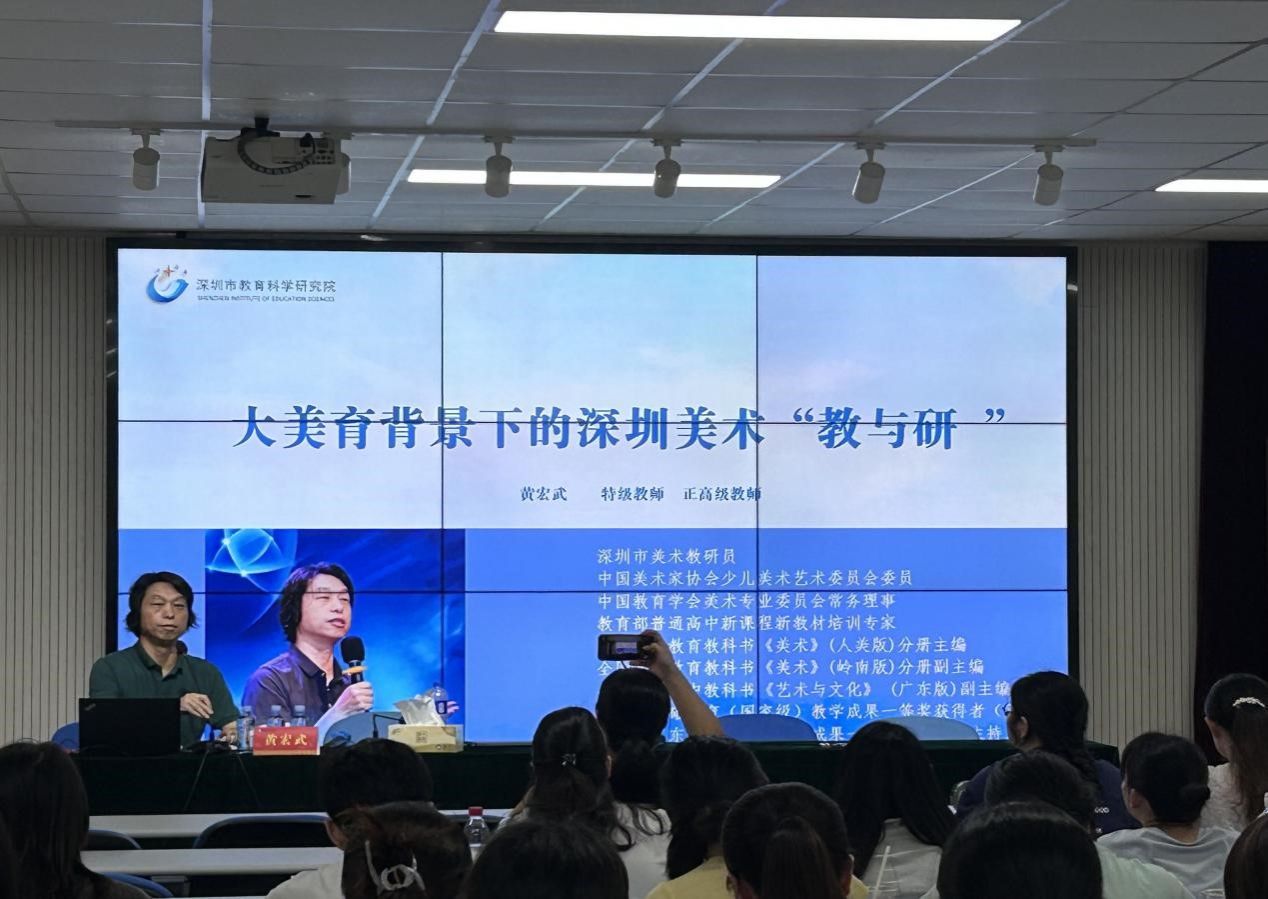 深圳市教育科学研究院德体艺教育研究中心主任黄宏武作了《大美育背景下的深圳美术“教与研”》的专题讲座,为美术学科核心素养的贯彻路径提供了深圳经验。黄主任认为,美育建设要抓地方经验、校本经验,通过开展中小学美术节、构建“四维范式”育人模型等方式创新教研。