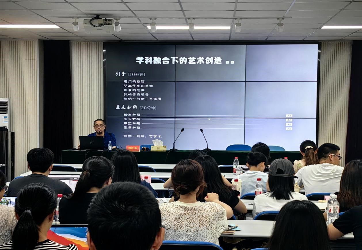 南京师范大学美术学院副教授容旺乔作了《学科融合背景下的艺术创造》的专题讲座,围绕美术学科的多样前景与多元施教策略展开探讨,将传统文化与信息技术相融合,并现场进行示范,躬行“术之融合游于艺”的新颖理念。