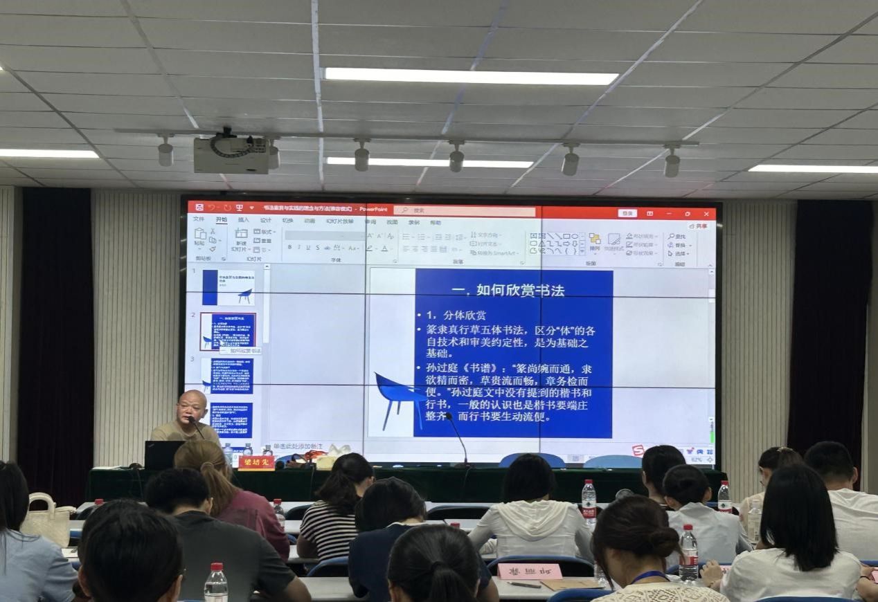 南京师范大学美术学院副教授梁培先作了《书法欣赏与实践的理念与方法》的专题讲座,从书法的贯气、非贯气、笔法、解体等四个方面入手,带领在座老师对书法进行分体欣赏,通过具身示范,剖析书法艺术教学的要义。