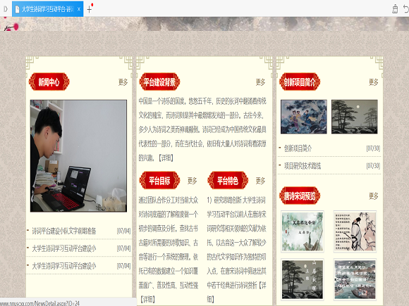 8月17日,大学生诗词学习互动平台网站部分正式建成,与此同时,与网站同步建设的微信公众号“金陵诗韵”也开始正式运营。