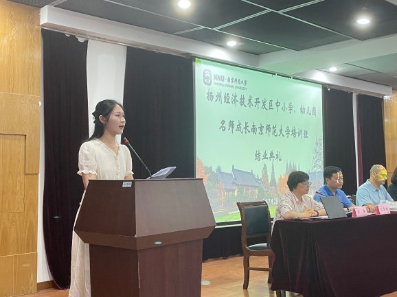 随后扬州经济技术开发区教育集团师资管理部的于晓莹部长发言,表达了对南京师范大学精心安排此次培训的感谢,认为通过此次培训,学员老师们深入了解了教育改革的新要求和新举措,学习了先进的教育理念和教学方法,拓宽了教学思路和教学手段,并且呼吁参与培训的老师们将本次培训的成果转化为实际行动,将所学知识应用到实际教学中,更好地为学生的成长和发展以及学校的发展做出贡献!