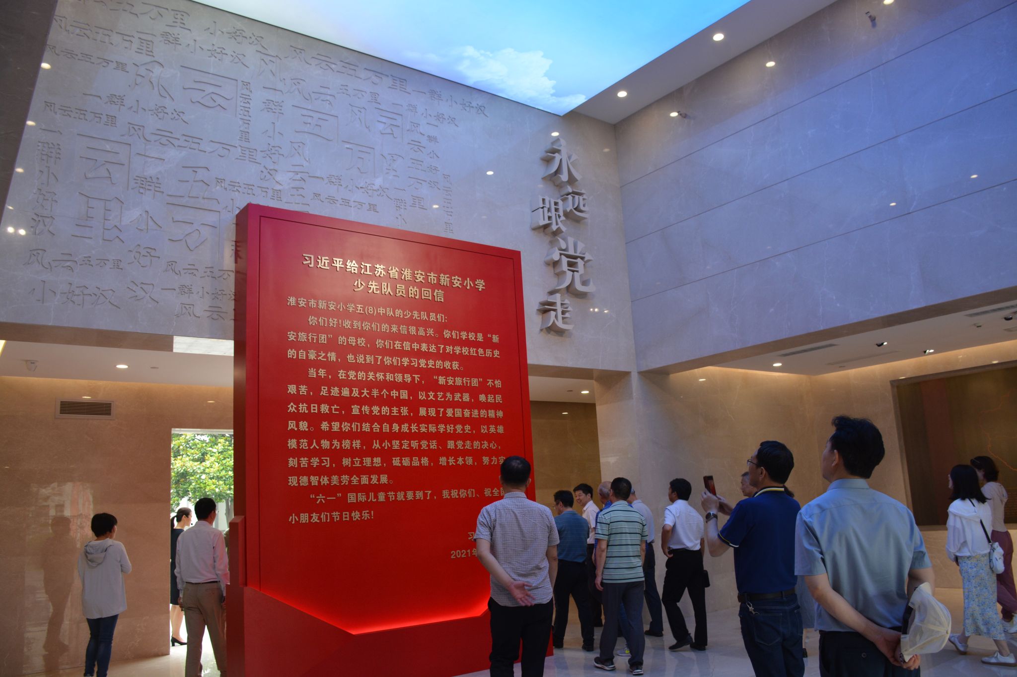 一行参观了新安旅行团历史纪念馆,在讲解员的带领下追寻“一群小好汉,风云五万里”的革命精神。大家详细了解新安旅行团诞生、发展和壮大的历史进程,深入了解新安旅行团以文艺为武器,抗日救亡的英雄事迹。诵读了《习近平给江苏省淮安市新安小学少先队员的回信》,深刻领会习近平总书记重要回信的丰富内涵,感悟习近平总书记对少年儿童的殷切期望与亲切勉励。