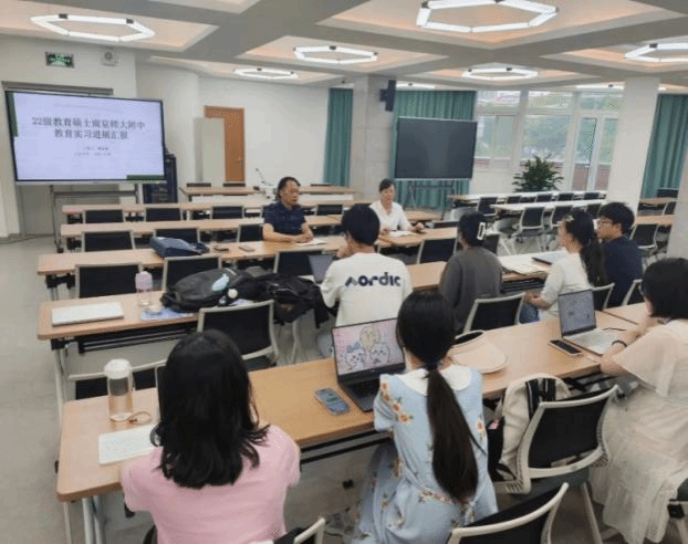 在南京市宁海中学,教育实习组长首先介绍了宁海中学实习生的基本情况,包括实习生的专业分布、实习年级与基本工作等。随后,各专业的实习生依次进行分享和交流,每位同学主要从教学实习和班主任实习两方面出发,汇报了目前的教学课时和基本工作,同时分享了实习的感悟和收获。实习生均表示在教育实习过程中受益匪浅,对中学学科教学和班主任工作都有了更加深刻的认识和体会,自身的教育教学能力也得到了提升和锻炼。副院长解凯彬对南京市宁海中学为实习生们提供宝贵的实习机会表示感谢,也向同学们强调了教育实习对教育硕士成长的重要性,勉励各位实习生要珍惜每一次教育实习和实践的机会,不断提升自我和积累经验,向成为一名卓越教师的方向努力!