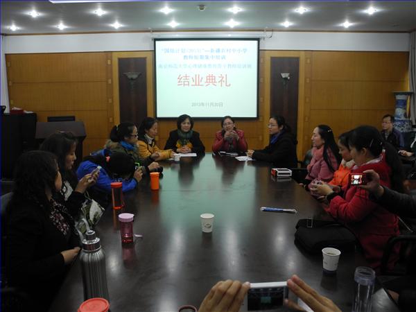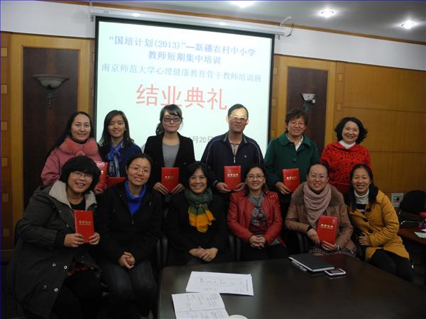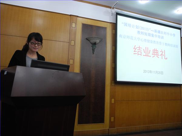 11月18日下午,由我校承办的针对新疆农村中小学的心理健康教育骨干教师培训班结业典礼在南京师范大学随园校区田北楼东会议室隆重举行。出席本次结业典礼的有南京师范大学心理学院党委书记冯大云、副院长蒋京川、孙宁成老师和应荣华老师,副院长蒋京川教授主持了本次结业典礼。