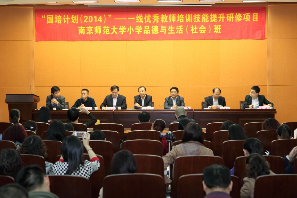 2014年金秋十月,桂花飘香,来自全国20多个省市区95位小学品德骨干教师齐聚“东方最美丽的校园”南京师范大学,参加为期十天的“国培计划”研修活动。10月28日上午,开班典礼在南京师范大学随园校区田南楼国际报告厅隆重举行。南京师范大学校潘百齐副校长、江苏省教育厅师资处金剑副处长、南京师范大学基础教育培训中心杨作东主任、教育科学学院顾建军院长、南京师范大学基础教育培训中心葛建国副主任,以及本次研修班执行负责人章乐老师出席了开班典礼,典礼由南师大教育科学学院冯建军副院长主持。