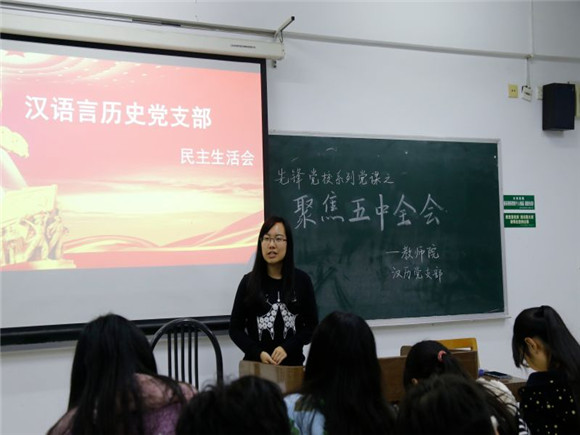 11月15日下午,在学明楼212室汉语言历史党支部如期举行了汉语言历史党支部民主生活会议,本次会议主要由先锋党校三期学员戴艺贝以及潘政达两位同志向汉语言历史党支部全体成员宣讲了以有关党的十八届五...
