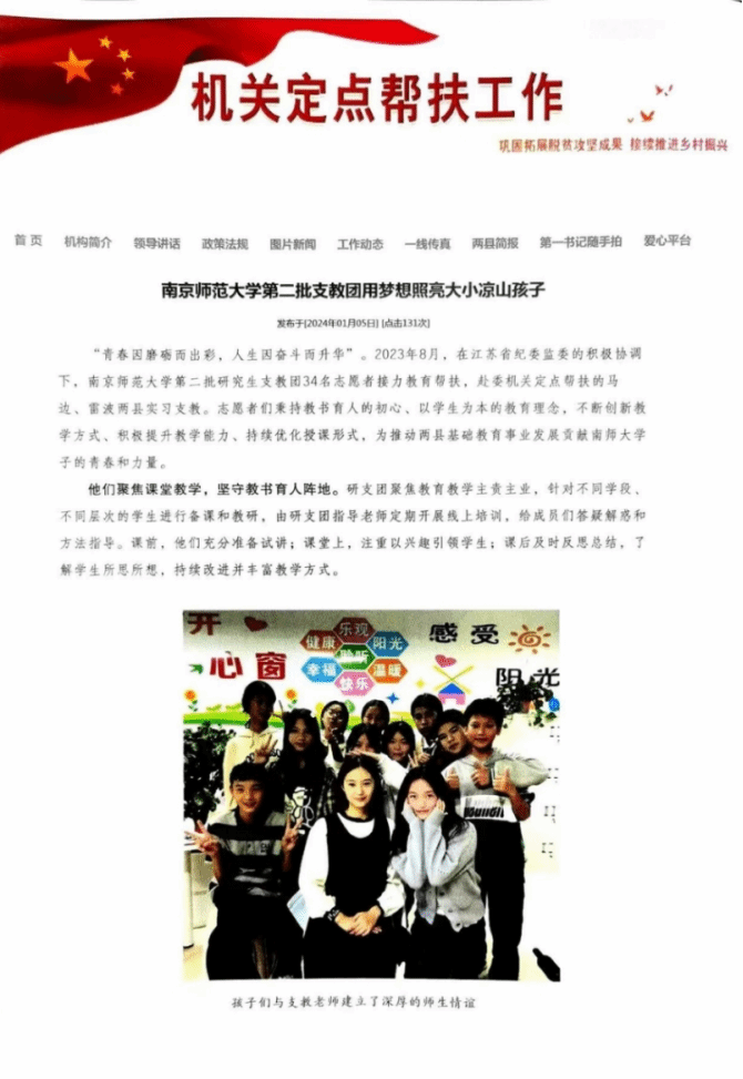 2024年1月5日,中央纪委国家监委内网以《南京师范大学第二批支教团用梦想照亮大小凉山孩子》为题,对我校研究生第二批四川支教团的事迹进行了宣传报道。“青春因磨砺而出彩,人生因奋斗而升华”。2023...