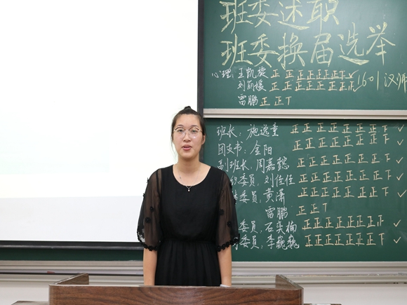 接着,进行的就是首届班委结束工作的简短报告和新学年班委的竞选。从班长开始,每一位在2016-2017学年担任班委的同学都向全体同学简单地报告了自己的工作内容、反思了自己你在过去一年中工作的不足,并且对全班同学的积极配合表示感谢。所有与会的同学也都用最热烈的掌声,给予首届班委在第一学年中工作的肯定。简短的述职报告结束以后,就开始了激烈的新学年班委竞争。在所有候选人认真地发表完竞选宣言、结束PPT展示后,在座的同学以公平公正的“无记名”投票形式,选择出了自己内心所支持与相信的班委团队。在前任组织委员张志伟同学和学生代表吴诗晨全公开透明的唱票计票下,2016级汉语言文学(师范)2017-2018大二学年的班委团体就此产生了。他们分别是:班长施逸童、副班长周嘉懿、团支书金阳、组织委员刘佳佳、宣传委员石奕楠、学习委员李巍巍、文体委员黄潇、心理委员王凯旋和刘丽媛。