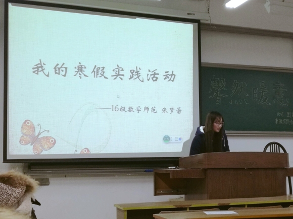 16级数学师范在学正楼403教室举办了“暖冬故事——馨然暖意”寒假实践分享活动。就如主题所写,全班同学在温馨的气氛中分享了自己在寒假在个人学习、社会生活、家庭习俗方面的温暖经历。