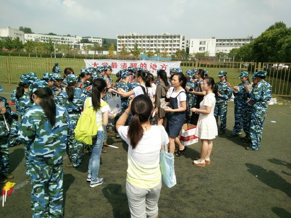 9月14日,16级新生军训已经进入第八天。顶着骄阳,15级英语师范班的十几名代表携月饼和柠檬水到东区操场慰问正在辛苦训练的16级学弟学妹们,给中秋节不能回家团圆的他们送去关怀。