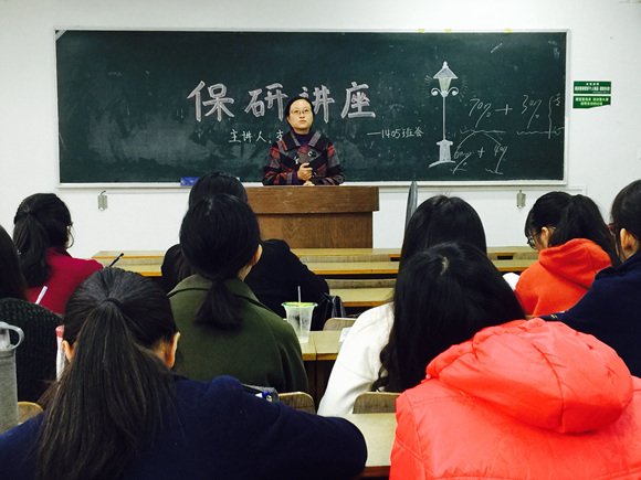 首先,支景老师开门见山,简要说明了目前保研与考研的现状,点明目前各专业大概的保研名额比例,以及具体政策要求。支老师尤其针对14级英语师范与13级转专业同班这一问题进行了解释,保证保研公平,每位同学都有平等的机会参与竞争。