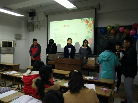 24日晚6:30,主题心理班会在彩色气球与炫彩灯光装饰环绕的教室里正式开始。主持人沙稼璐、倪佩玉简要介绍本次班会的简要背景,并给同学们分发“萌萌哒”心愿卡片,记录下大一时数学师范同学各自不同的心愿与小小的理想;之后进行的BINGO游戏互动既是头脑思路上的风暴,也是小团队合作能力的锤炼,活动中,每位参与者都获得了精美的礼物——兔子蛋糕饰品挂坠。每份小礼品都预先附赠上心理气象员亲笔写下的温馨心语,得到奖品的同学在收获礼品和喜悦的同时,打开包装纸盒的那一刻也更多的感受到一份情意上的温存与美好。
