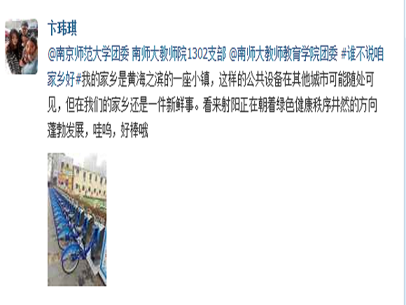 13级历史师范全体同学在享受假期的同时,都积极响应校团委以及院团委的号召,在各自的家乡实践着“温情暖冬•师心相伴——把爱带回家”为主题的大学生寒假教育实践活动。结合专业特色,大家对于“谁不说咱家乡好”活动中体现出的历史地理以及城市史色彩都很感兴趣。大家将自己的家乡特色民俗活动或者历史通过腾讯微博平台,向校内外人士展现出来。