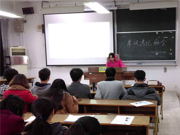 14级英语师范班在仙林校区学正楼307教室有条不紊的开展了一场考前班会。班会由班长周静怡同学主讲,全体同学参加并在诚信考试承诺书上签字。