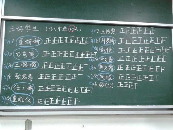 会议伊始,班长逯珺铭同学向全班同学宣读了《南京师范大学优秀本科学生评比办法》,让大家清楚了“优秀评比”的细则。副班长薛文潇同学将申请“优秀班干部”、“三好学生”和各类单项奖的同学名单分别写在黑板上。然后全班同学对照黑板上的名单按照规定人数进行不记名投票。接着,团支书赵倩同学和学习委员张越同学当场唱票。最终,方弯弯同学被推选为“优秀班干部”,董妍妍、刘梦琦等10名同学被推选为“三好学生”,张若青、汤旺忠等6名同学被推选为单项奖获得者,评比工作圆满完成。