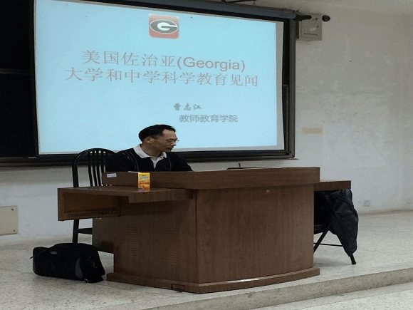 有幸邀请到从美国归来的曹志江老师为大家进行了一场“美国佐治亚州大学和中学的科学教育见闻”专题讲座。此次讲座由辅导员殷志伟老师主持,14级全体同学积极参加。本次讲座让同学们受益匪浅,取得圆满成功。