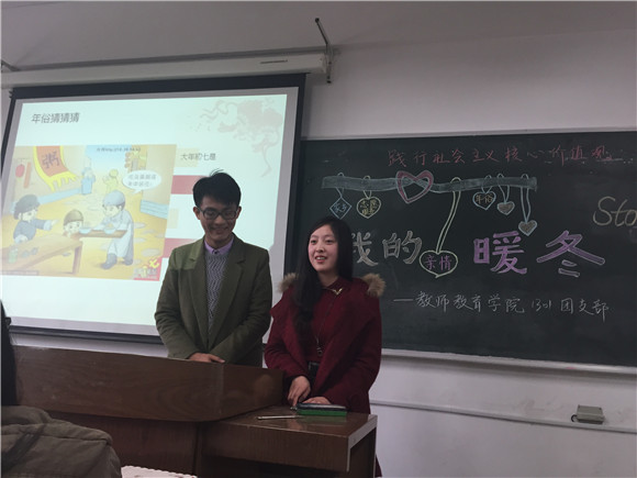 13级汉语言师范在学明楼310教室举办了“我的暖冬故事”寒假实践交流会。此次活动根据寒假实践的内容分为“年俗”、“家乡”、“志愿服务”和“亲情”四个环节,旨在践行社会主义核心价值观,由丁凡同学和戴艺贝同学主持。