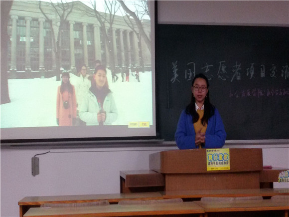 接着,刚刚参加完14年寒假志愿项目的社会学系研一的学生为我们讲述了她的美国之旅。她介绍了多样的志愿项目、丰富的见闻经历,同时诠释了国际志愿活动精神:平等性、奉献性、自愿性。最后,她指出,每个人在美国的感受都是不同的,得到与否在于是否用心、积极去体会、去学习、去创造。