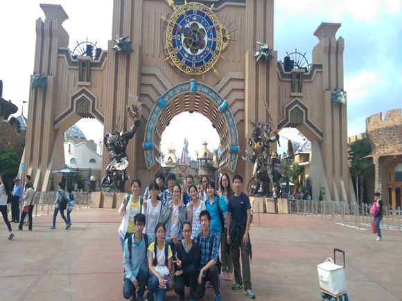 虽然大家都起得很早搭乘大巴车,但是在车上依旧很亢奋的在一起研究即将要玩的各种项目,早上九点半大巴车到达嬉戏谷。在停车厂大家就发现没有几辆旅游车或者私家车,本来就很有兴致的同学们愈加兴奋了,今天肯定可以好好玩,不用排长队。在嬉戏谷门外大家拍了集体照就各自组成小队直奔自己想要的娱乐设施而去。