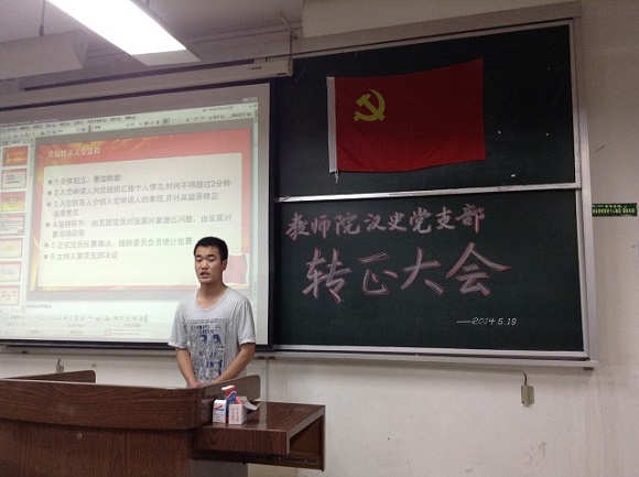汉语言历史联合党支部组织委员齐朋利同学主持。汉语言历史联合党支部的正式党员与预备党员准时参与会议。
