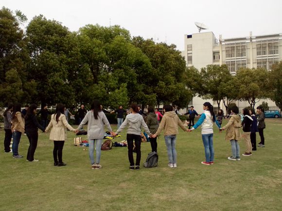 最后一个游戏是“同心协力”,将参加的同学平均分为两组,每组至少五人,首先是每组派两人背靠背坐下,双臂相互交叉,合力使双方同时站起来,然后每组人数逐渐叠加至五人,评出最快完成任务的小组,失败者则要接受惩罚。