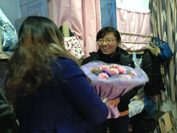 当天晚上,辅导员翟云秋老师来到教师院女生宿舍,准备如同往常一样与同学们聊聊家长里短,聊聊生活学习中的开心事与麻烦事;另一边,英师转专业班的班委们在班长汪文倩、团支书顾轶静的带领下,已经悄悄地来到翟老师所在的宿舍。当她们将一大束代表全班同学心意的花束送到翟老师手里时,翟老师脸上露出了孩子般的笑容,并感谢11级英师转专业班同学的节日祝福。组织委员吴佳还代表全班同学来到辅导员办公室,给其它年级的辅导员老师送上了花束和贺卡。
