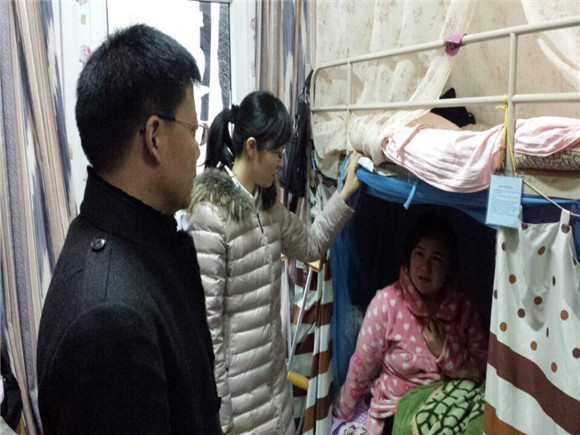 院党委副书记江胜尧老师和11级辅导员翟云秋走进南师大15栋学生宿舍,亲切看望11级汉师班受伤的新疆同学玛依热。
