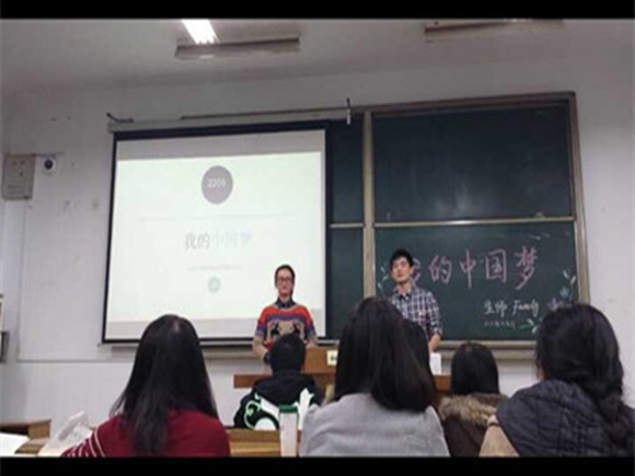 12级生物师范班在仙林校区北教313举办“我的中国梦”主题班会,本次班会由11、12级生物师范班学委刘威和王慧敏主持,11、12级生师班主任沈老师,刘春琼老师,11、12级生物师范班同学均参与到此次活动中。