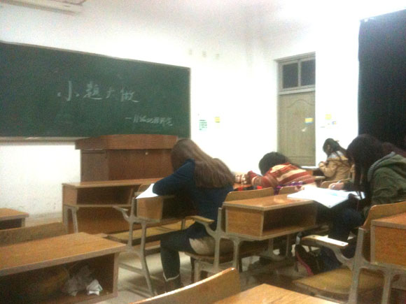 不过接下来的活动中,地师班同学们的表现很明显是兴奋胜过了忐忑。首先,大家做卷子都非常认真,教室里可谓是鸦雀无声;再者,尽管深秋的夜晚教学楼里的教室略显清冷,但是同学们都在努力地奋笔疾书,丝毫未受天气的影响。