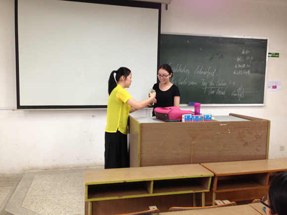 早晨的高级英语课和英国文学课前,刚上任的班长刘人睿和团支书顾轶静代表全班同学将礼物交给了两位任课老师,并传达了同学们最真挚的祝愿。