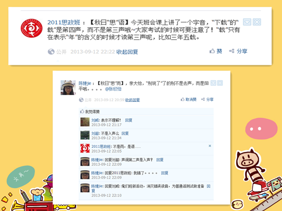 该活动的创意来自11级思政班全体班委,具体实施内容包括如下几点:1、人人平台互动@,纠正发音:同学们通过自己日常对班级同学的观察,利用人人平台发布状态,善意地为身边同学或其他人纠正错误发音并@这位同学或2011思政班,潜移默化地引导同学正确发音。2、资源共享,发音易错字词汇总发布:将平日里同学们发音易错的字词进行汇总,统一发布状态,减少同学日常用语中常见的发音错误。3、诵读:大力倡导同学在早晨自行朗读普通话水平测试辅导材料以及课前十分钟大声标准朗读字词文章。
