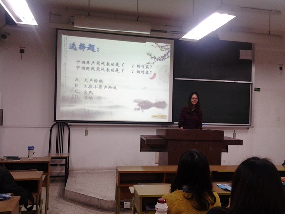 在期中考试周,王乐娜同学带来的演讲主题是“国民党到底代表什么”。王乐娜同学结合中国现代史的期中作业和近期阅读的相关专业书籍,分享了关于《党员、党权与党争》一书的新的体会。王乐娜同学以出了一条选择题请同学回答的形式开场,立刻拉近了与同学们之间的距离,把同学们带入一种模拟课堂的情境中。王乐娜同学良好的台风,流利的普通话,精彩的PPT,神情自若中透露出的是一种自信。她从三个方面讲述国民党代表的阶级性质,鞭辟入里,由浅入深,颇有青年教师风范。其中最为突出的是根据民国时期上海地区“三友劳资纠纷案”的实例进行讲解,生动形象,内容贴切,留给同学们深刻的印象。