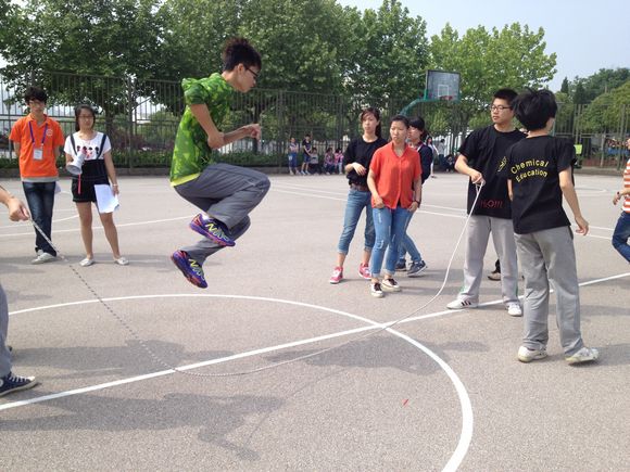 活动伊始进行的是“夹心饼干”比赛,10级化学师范班的两名同学配合默契,顺利地把气球带到了终点线。接下来是由王涛兴、孙华越、沈梅彬和邹莉同学参加的“投桃报李”。曾经作为班级羽毛球种子选手的四位同学在这项比赛表现得相当优秀。尤其是沈梅彬和邹莉同学凭借熟练的发球技术和灵巧的接球技巧,以接到10个球拿到了此项比赛的第一名。跳绳项目紧随而来。在这之前,10级化学师范班的同学已经训练了好几天,做好了充足的准备,迎接挑战。比赛一开始,同学们连续完成了几个大回环。在最后的20秒,由于体力问题,大回环一度被打断。但是在其他同学的加油和鼓励声中,这些同学还是取得了较好的成绩。“五人六足”是10级化学师范班的王牌项目,参加此项目的五个同学蝉联两届比赛的冠军,以速度和整齐著称。只见队长一声令下,五个同学迅速地跑动起来,一边喊着口号,一边向终点跑去,赢得了大家一致的喝彩,并再次获得夺得本项目的第一名。在最后的托球绕杆和拔河项目中,同学们同样齐心协力,表现非常精彩!