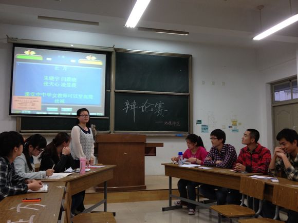 11级地理师范班在仙林校区北区教学楼409教室顺利开展了辩论赛。为了深入同学们对教师领导力的理解,加强班级凝聚力,提高同学们的课外知识储备,地理师范班全体同学在教师院副院长冯奕竸老师指导下决定以“课堂上,中学女教师可不可以穿高筒黑丝袜”和“教改中,校长和一线教师谁更重要”两个实事热点为辩题,进行班级辩论赛。