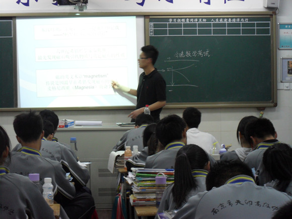 5日晚六点,五名学生来到天印高中,因提前与学校老师沟通联系,争取到了两个班级(高二1班和3班)的讲课机会。此次讲课安排在晚自习时间,6点半到7点10分的一节课,两个班同时进行,分别由余峰和韩冬恒主讲,其余队员则帮助分发问卷并全程摄影照相。基于26日的试讲经验,两名队员刚上讲台虽然有一些紧张,不过很快进入状态,在于学生进行了短暂的互动之后,很快进入主题。本次讲课对之前的内容进行了适当的补充和调整,分别就一些典型的物理名词运用不同的方法进行剖析和理解。讲课中强调,对物理名词的透彻理解对以后学生学习更深的概念提供了重要基础,为之后的拓展学习有很深远的影响,其中四类方法总结为:辨析联系法、类比联想法、咬文嚼字法以及追本溯源法,掌握这些方法能够帮助建立并加深学生的逻辑分析能力以及科学学习方法的挖掘。讲课中,学生对于咬文嚼字法有很大兴趣,在讲到“场”、“势”等概念时,便积极地回应队员的提问和互动,这使得课堂的气氛十分活跃,讲课结束后,同学们又耐心地填写完问卷,这些都被记录在录像和照片中。第二节课,老师热情地邀请队员们到高一5班和6班与学生进行交流,队员们分成两队,分别分到两个班,队员们就自己的经验,向学生分享了一些学习方法及感想,同学们听的很认真,下课后也乐于同队员们交流沟通,所有这些使得队员都感到收获良多、不虚此行。