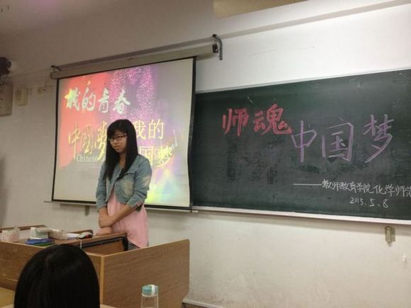 12化学师范班大部分同学聚于仙林校区学明楼206教室开展“师魂•中国梦”主题班会。这次班会由团支书潘芸同学主持。