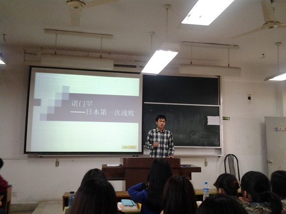庄晨曦同学此次讲演的话题是“诺门罕—日本的第一次战败”,他从一次战争延伸到对日本外交政策的解读。他通过简单清晰的讲义把内容分为四个板块,为同学们详细讲解了诺门罕战争的原因、四次战役经过、停战和约、战争的意义。讲演完毕后,中国现代史王志龙老师进行了客观详细的点评,指出了优势与不足。庄晨曦同学的讲义运用了地图和超链接,使内容更加详实生动,并表达了自身的观点。值得一提的是庄晨曦同学的选题巧妙,以一次战争为切入点,分析了当时的形势与背景和战争中重要人物的相关言论,为以后上台讲演同学选题提供良好的开端。课堂讲演面对的是同学们,可是走上讲台后面对的是学生,所以在讲授过程中要注意互动和交流。