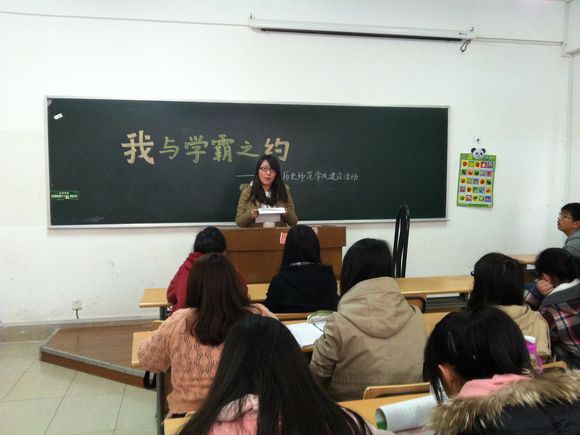 12级历史师范的同学们聚集在学明楼215教室,开展本学期的第一次学风建设活动。本次活动的主题是我与学霸之约,主要围绕大家的学习方法和学习经验展开讨论和交流,活动由学习委员傅莹主持。