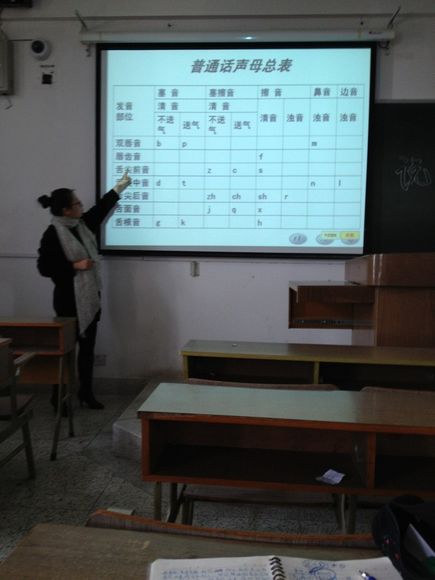 由于此次活动主要针对普通话考试,所以邀请了班主任李园老师为同学们进行讲解。李园老师长期负责普通话教学,对普通话考试也非常了解。首先,李老师向同学们介绍了普通话考试成绩的等级划分及其分数线,并告诉同学们作为一名师范生,普通话所应该达到的等级和要求。其次,李老师将普通话考试的流程和每一部分的分值与考核要求进行了一一的介绍。同时,对于各个方言区存在的普通话缺陷,李老师也进行了一一的指出,让同学们对自己可能存在的问题有个初步的认识与了解。随后,李老师将普通话中声母,韵母的发音规则进行了讲解,并播放音频,让同学们能够更好地了解其规则。