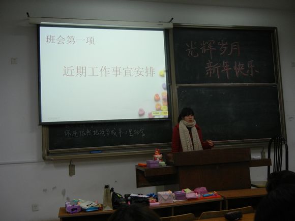 11级地理师范班班主任赵家荣老师与班级全体同学在此召开了本学期最后一次班会。因为正值新年与期末,此次班会就以迎新与期末复习为两大主题。